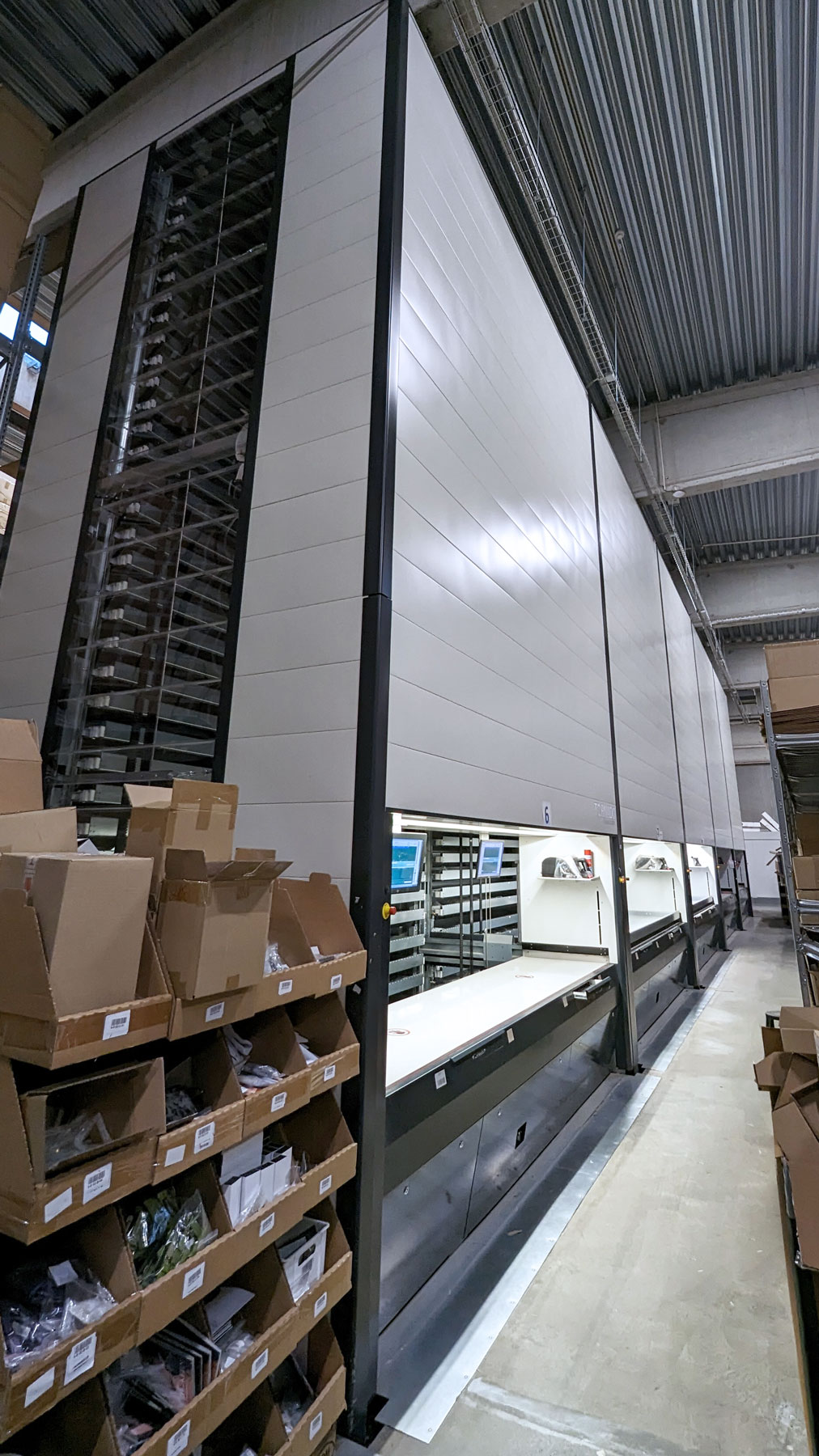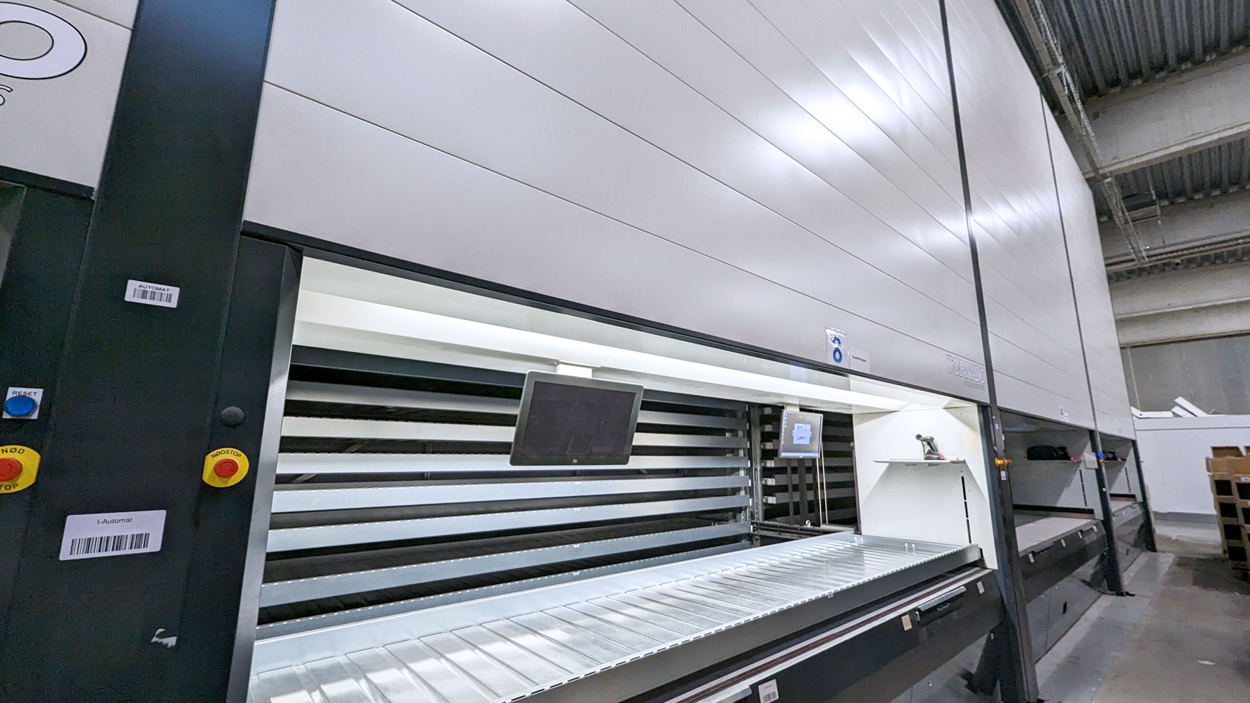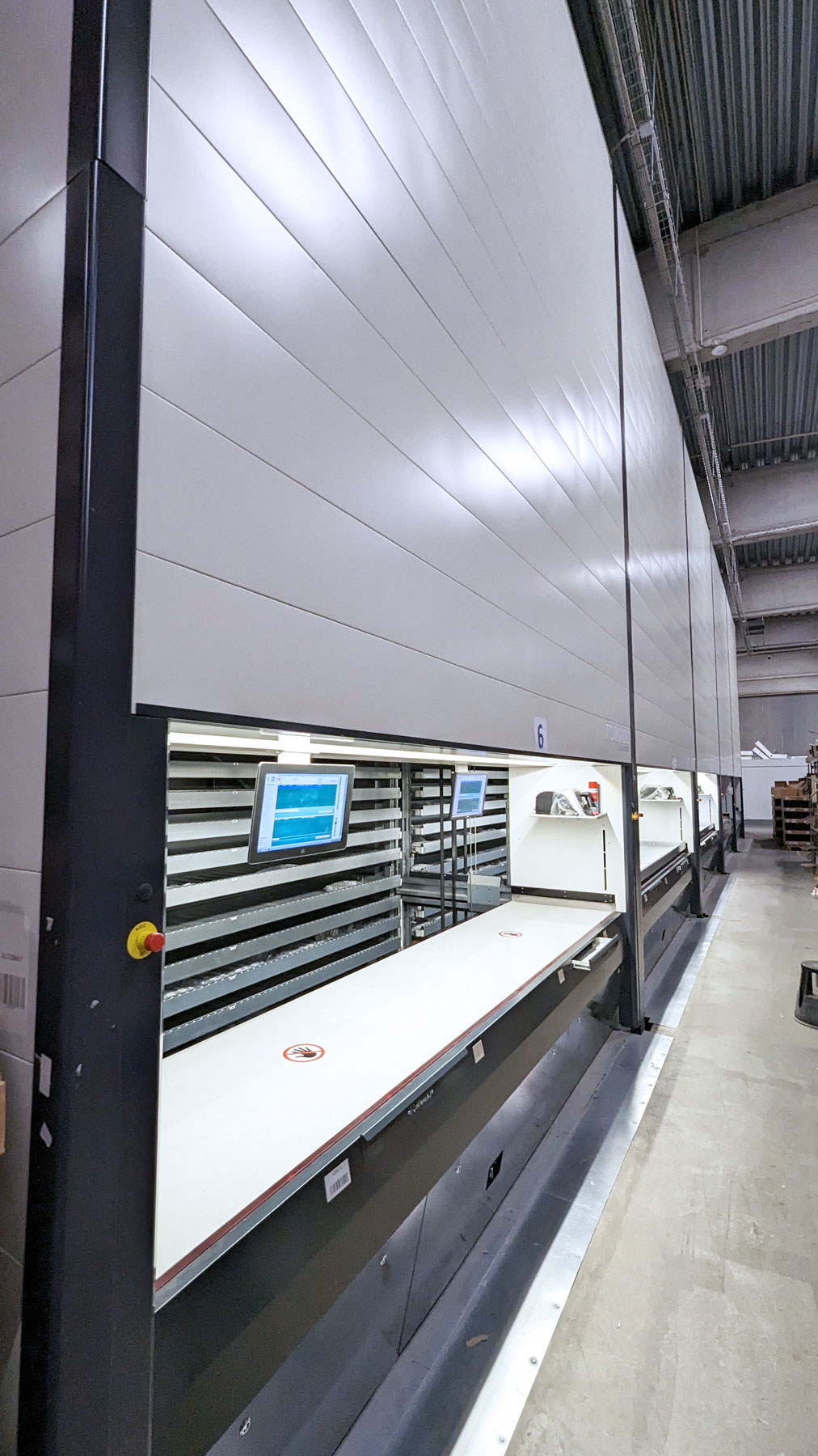 The machines have a Height of 9 000 mm and can very easily be lowered during installation. The Trays have a Width of 4,000 mm and a Depth of 820 mm which gives a storage area of 3.28 m2 per shelf. With 81 Trays per machine, this gives a total storage area of 266 m2. At the same time, the machines only take up 13.5 m2 of floor space.