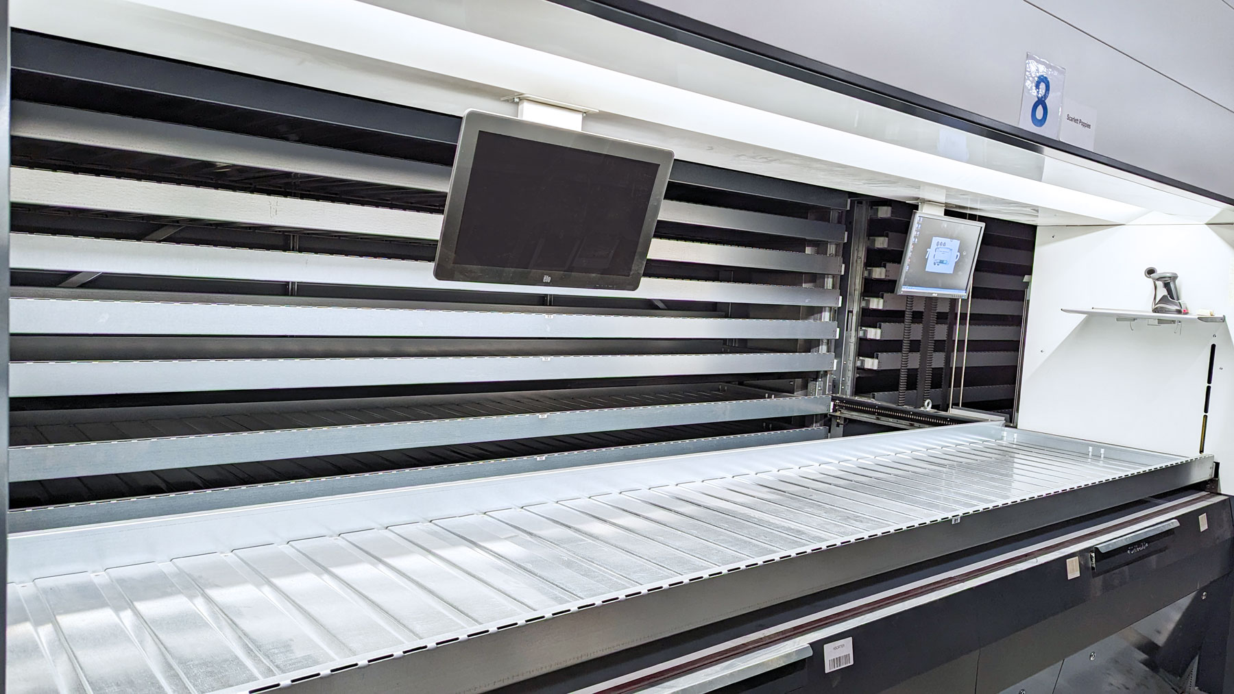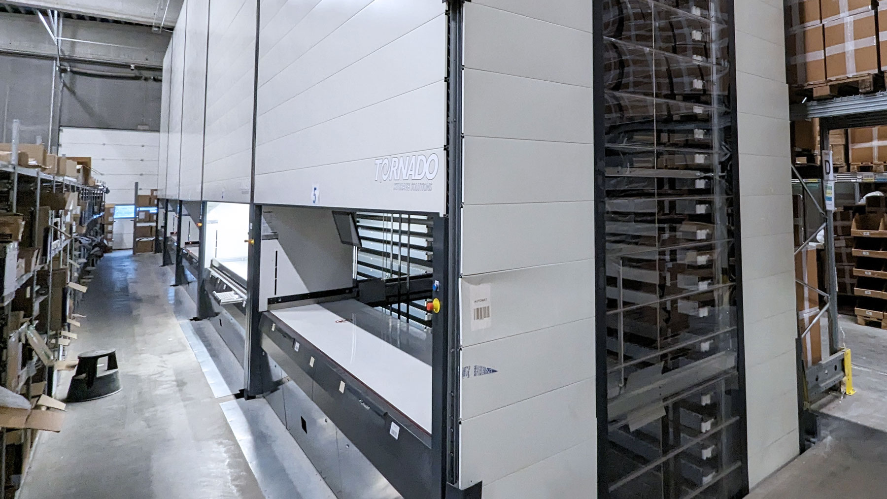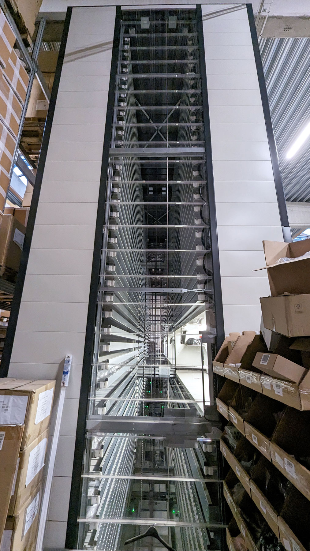 The machines have a Height of 9 000 mm and can very easily be lowered during installation. The Trays have a Width of 4,000 mm and a Depth of 820 mm which gives a storage area of 3.28 m2 per shelf. With 81 Trays per machine, this gives a total storage area of 266 m2. At the same time, the machines only take up 13.5 m2 of floor space.