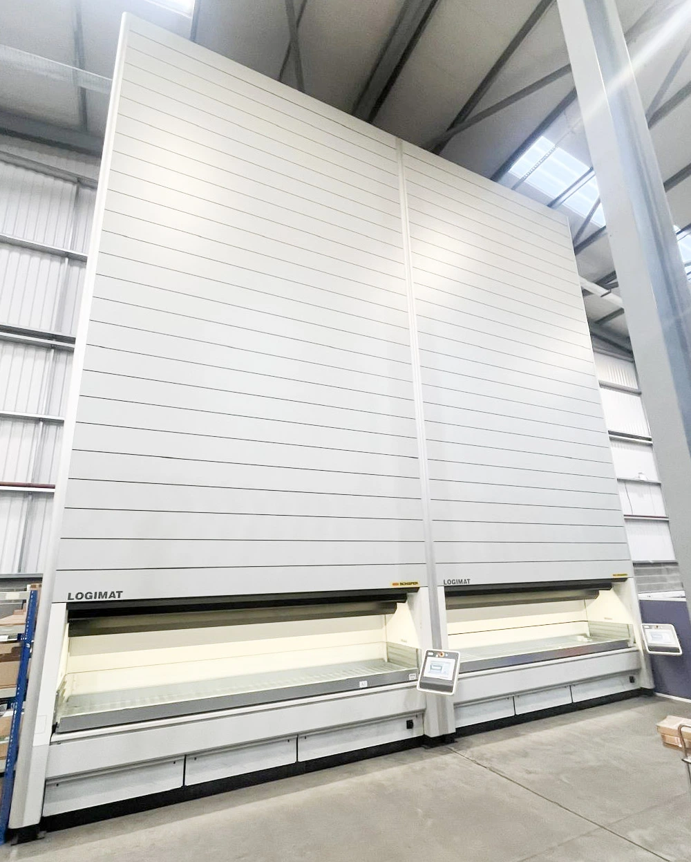 Each shelf in these vertical lift modules has a width of 4,025 mm and a depth of 815 mm, which corresponds to approximately 3.28 m² of storable space per tray. With 76 trays per machine, a total storage area of 249 m² per Vertical Lift Module is achieved. Together, the two machines provide almost 500 m² of storage space, while each machine occupies only 14 m² of floor space. This creates a very space-saving and efficient storage solution where every square metre counts.